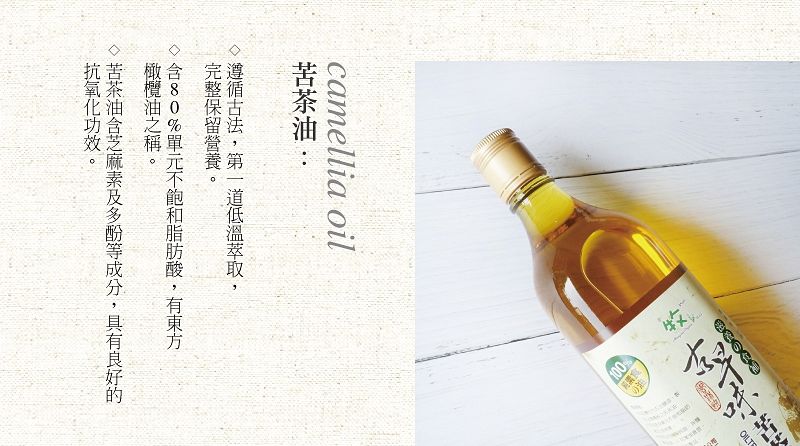 使用方法:本苦茶油可用於拌飯、拌麵線或炒菜等,可增強食慾。